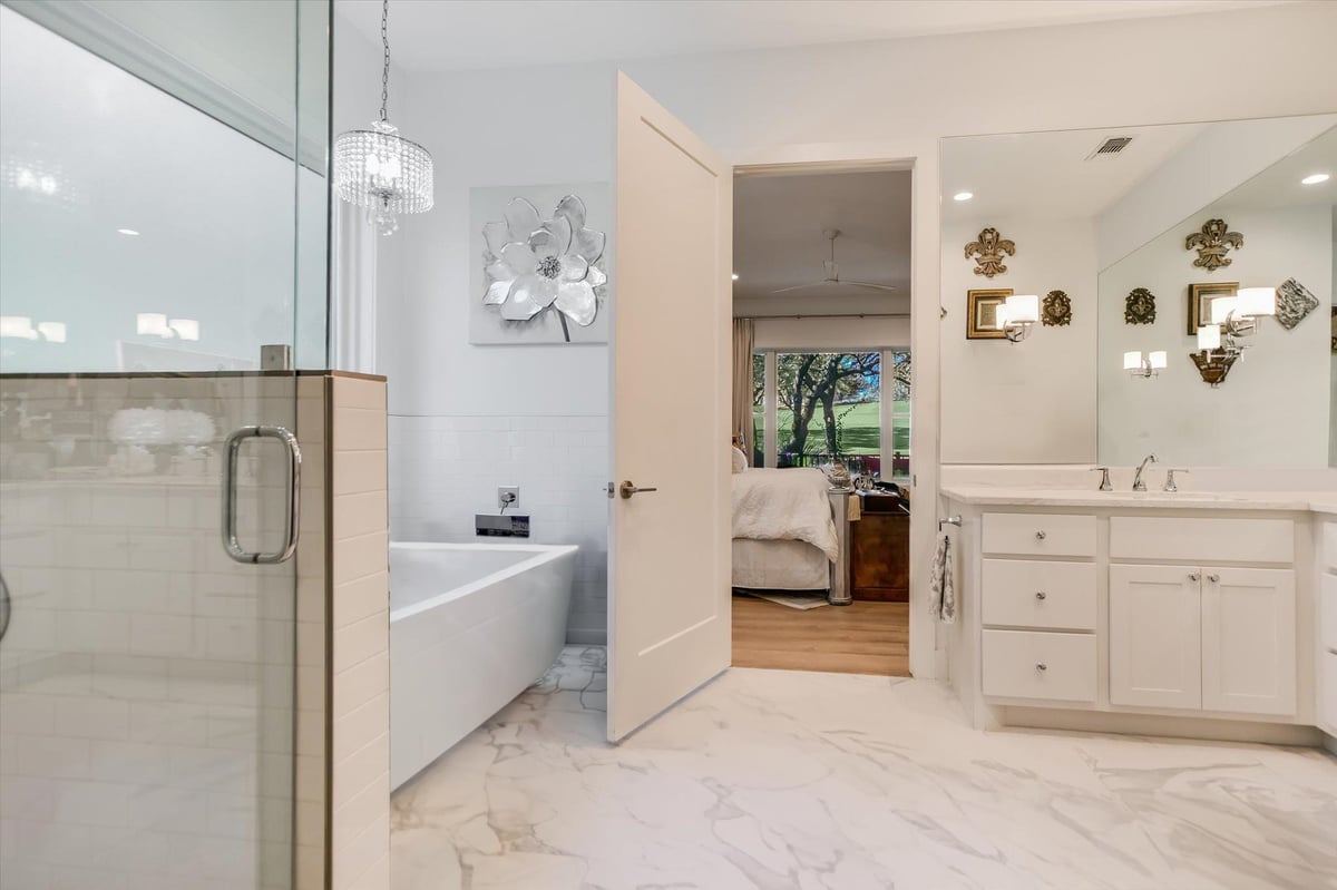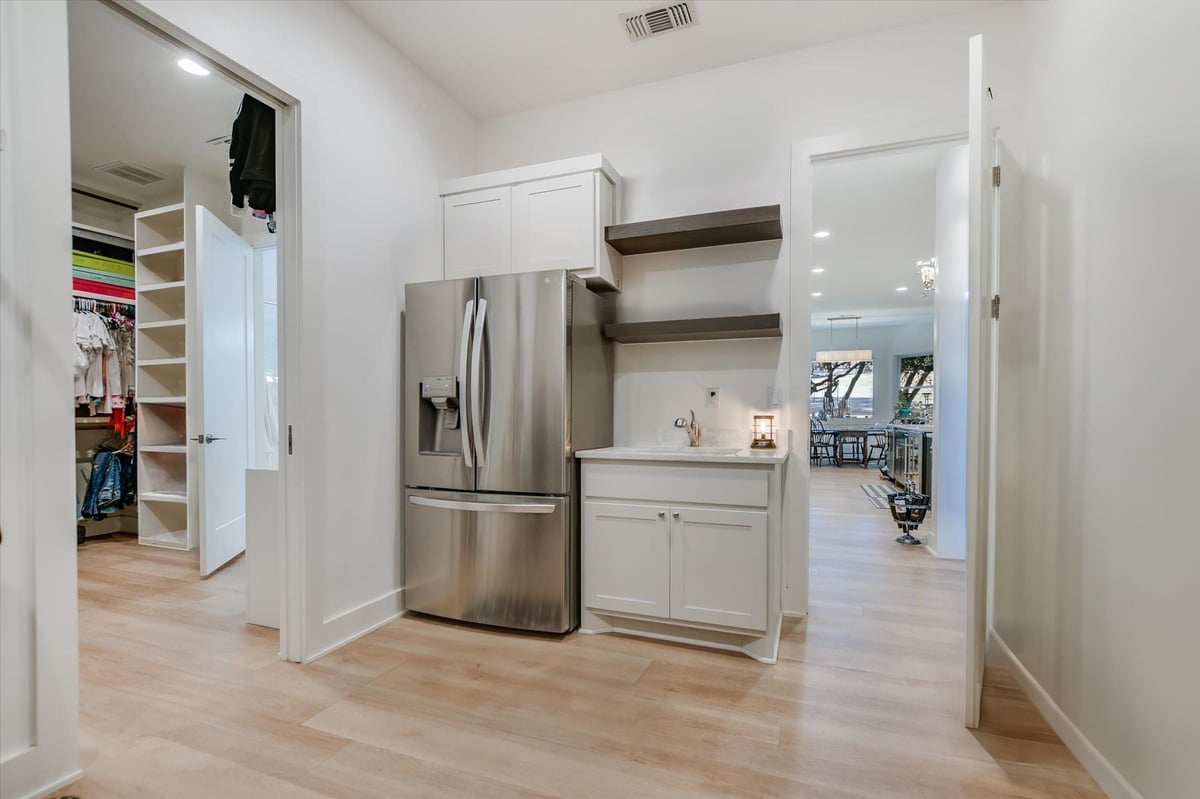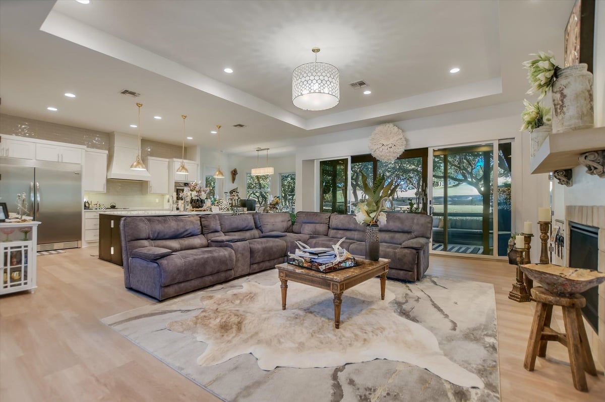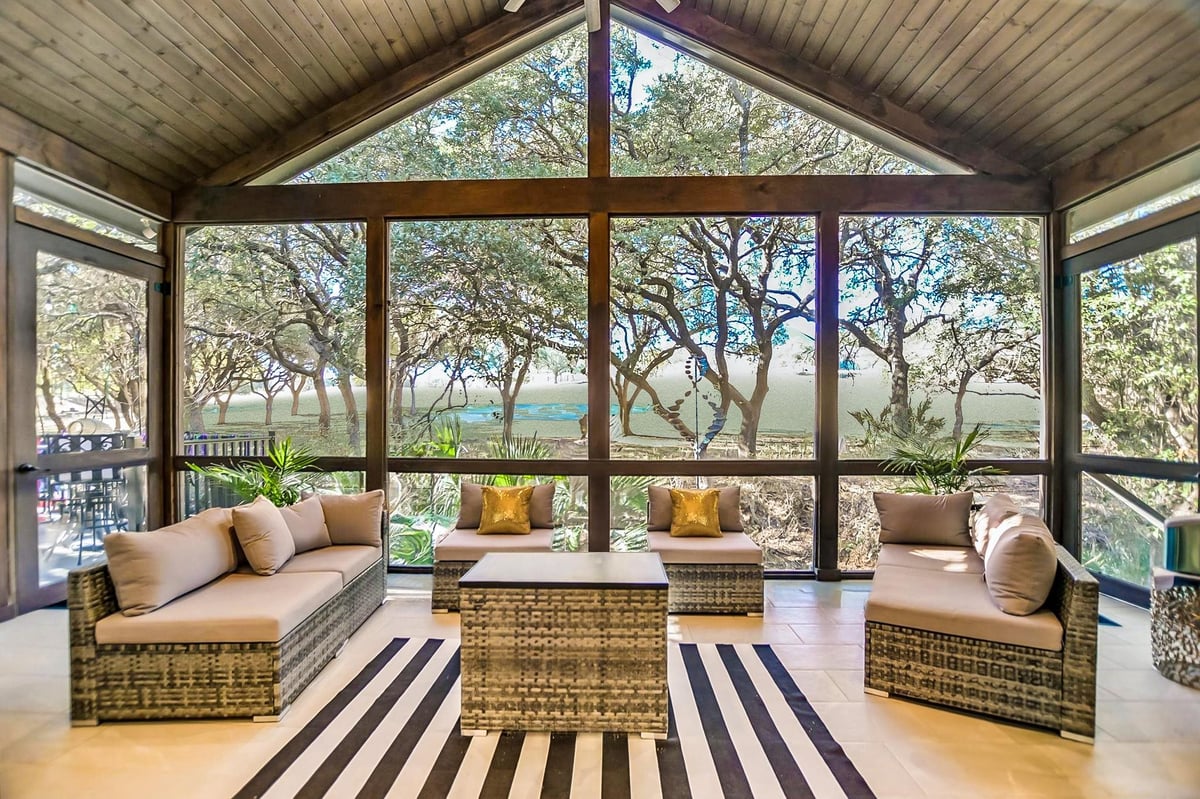 Built in 2020, this thoughtfully designed 2,750 sq ft residence is quietly positioned at the end of a cul-de-sac in Applehead West, overlooking a tree-lined creek and the #4 fairway of Apple Rock Golf Course. Mature oaks provide privacy while preserving scenic golf course views. The Austin stone exterior paired with a metal roof delivers a timeless Hill Country aesthetic. Inside, the home offers 3 bedrooms, 3.5 baths, and a home office, with light-filled living spaces defined by wide-plank vinyl flooring, layered ceilings, and expansive windows that frame the surrounding landscape. The open living, dining, and kitchen areas flow seamlessly for effortless everyday living and entertaining. The kitchen boasts soft-close custom cabinetry, double ovens, built-in refrigerator, and a generous island that anchors the space. The sequestered primary suite offers a private retreat, featuring a spa-inspired bath with marble floors, a walk-in shower, and a soaking tub. The utility room connects directly to the primary closet, which offers an abundance of built-ins for exceptional organization. A spacious screened-in patio with wood ceiling and misters extends the living space outdoors, ideal for year-round enjoyment of tranquil fairway views. With its quiet cul-de-sac setting, scenic golf course backdrop, and high-quality design throughout, this Applehead West residence offers refined, low-maintenance living in one of Horseshoe Bay's most desirable communities.