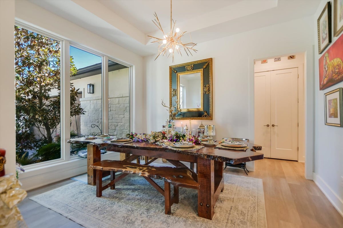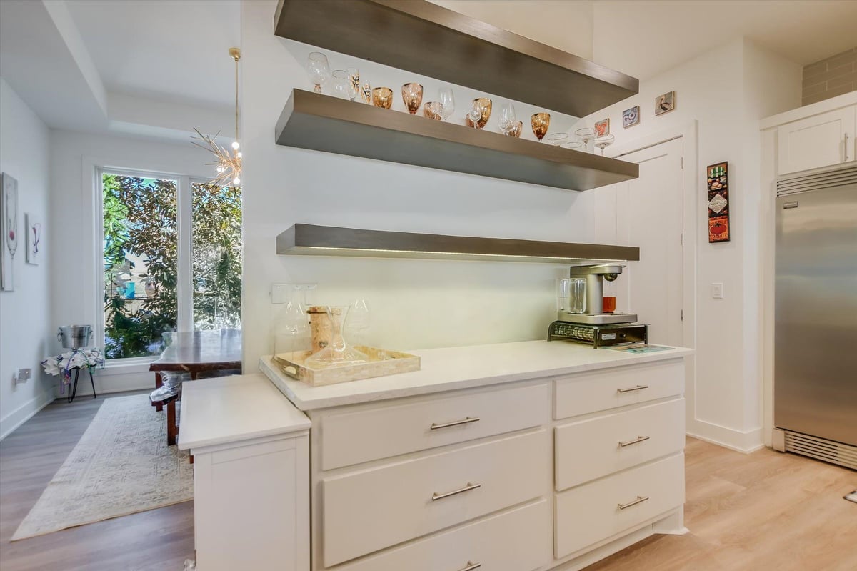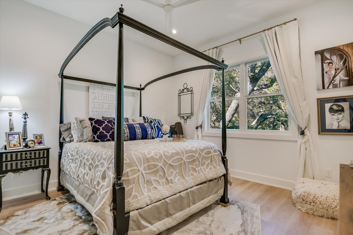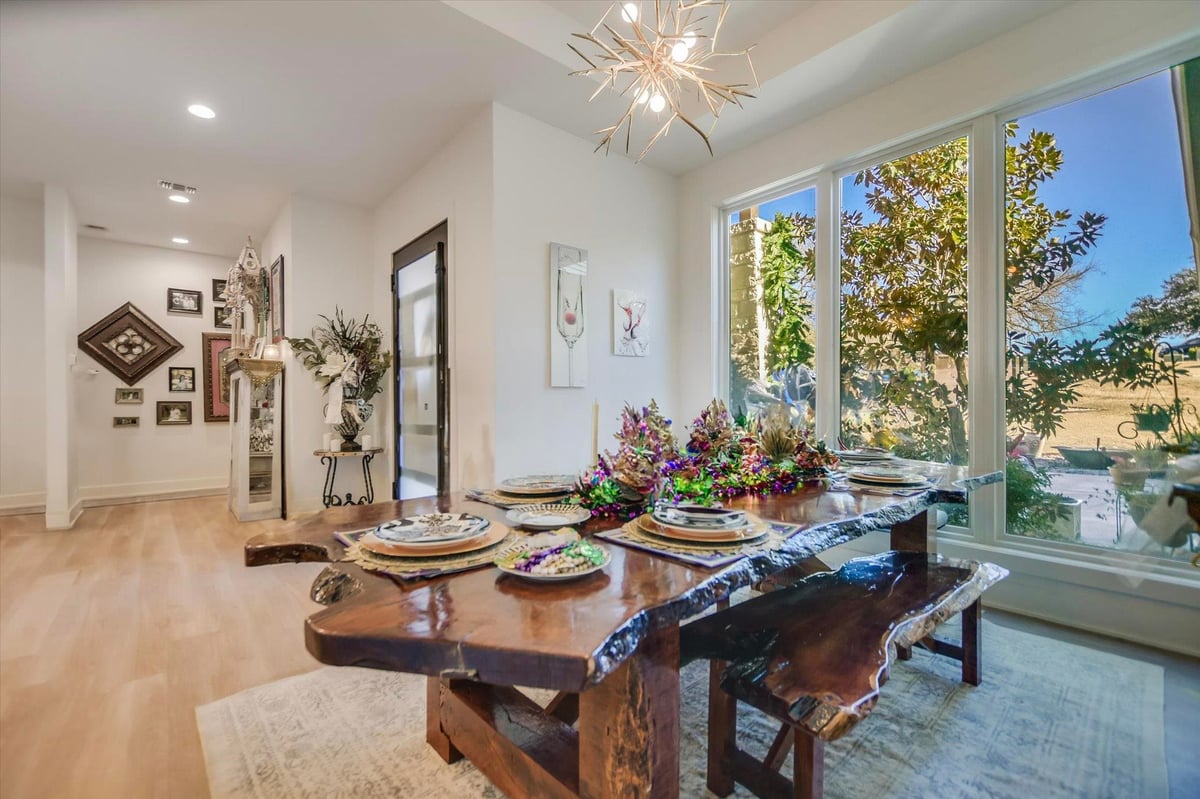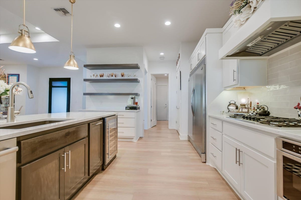 Built in 2020, this thoughtfully designed 2,750 sq ft residence is quietly positioned at the end of a cul-de-sac in Applehead West, overlooking a tree-lined creek and the #4 fairway of Apple Rock Golf Course. Mature oaks provide privacy while preserving scenic golf course views. The Austin stone exterior paired with a metal roof delivers a timeless Hill Country aesthetic. Inside, the home offers 3 bedrooms, 3.5 baths, and a home office, with light-filled living spaces defined by wide-plank vinyl flooring, layered ceilings, and expansive windows that frame the surrounding landscape. The open living, dining, and kitchen areas flow seamlessly for effortless everyday living and entertaining. The kitchen boasts soft-close custom cabinetry, double ovens, built-in refrigerator, and a generous island that anchors the space. The sequestered primary suite offers a private retreat, featuring a spa-inspired bath with marble floors, a walk-in shower, and a soaking tub. The utility room connects directly to the primary closet, which offers an abundance of built-ins for exceptional organization. A spacious screened-in patio with wood ceiling and misters extends the living space outdoors, ideal for year-round enjoyment of tranquil fairway views. With its quiet cul-de-sac setting, scenic golf course backdrop, and high-quality design throughout, this Applehead West residence offers refined, low-maintenance living in one of Horseshoe Bay's most desirable communities.