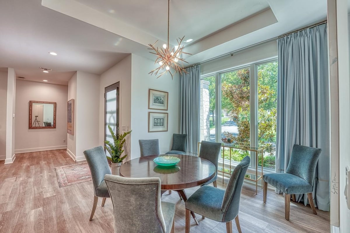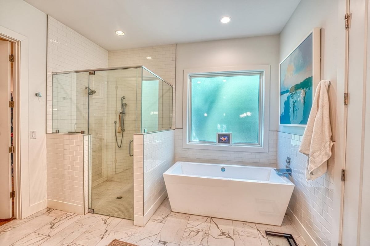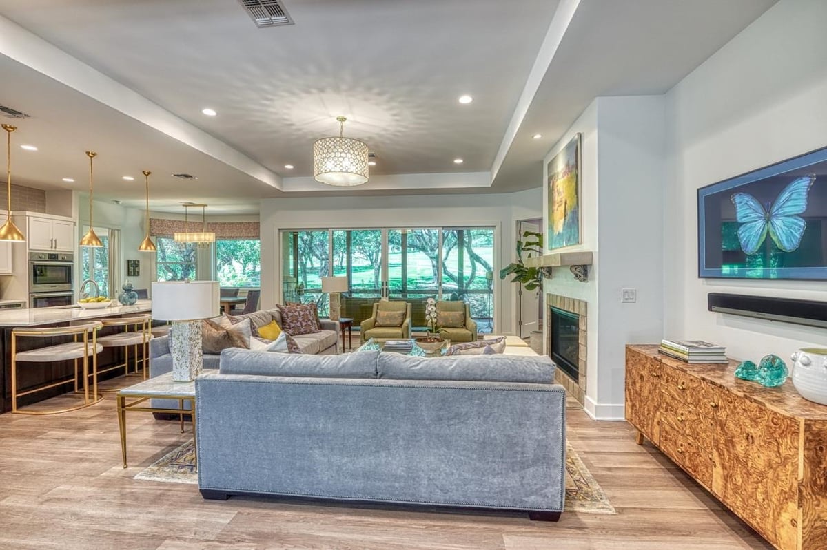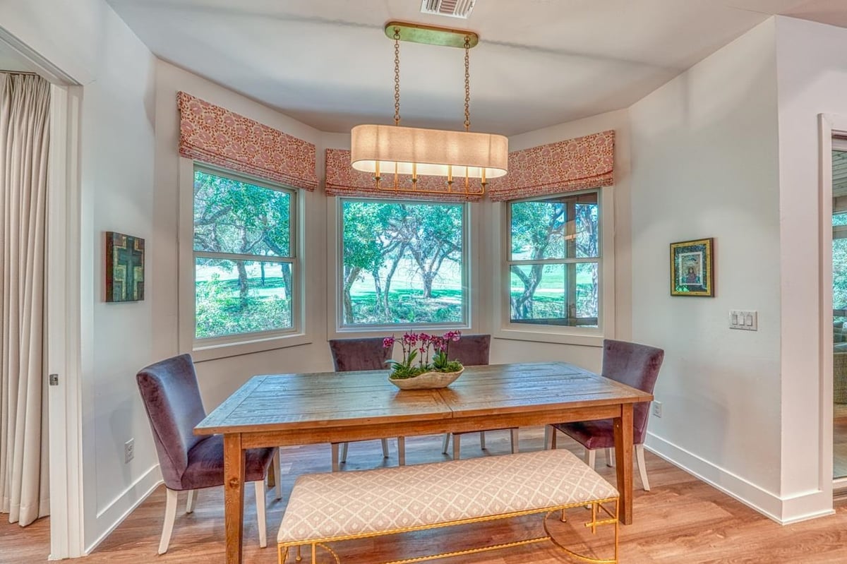 Built in 2020, this thoughtfully designed 2,750 sq ft residence is quietly positioned at the end of a cul-de-sac in Applehead West, overlooking a tree-lined creek and the #4 fairway of Apple Rock Golf Course. Mature oaks provide privacy while preserving scenic golf course views. The Austin stone exterior paired with a metal roof delivers a timeless Hill Country aesthetic. Inside, the home offers 3 bedrooms, 3.5 baths, and a home office, with light-filled living spaces defined by wide-plank vinyl flooring, layered ceilings, and expansive windows that frame the surrounding landscape. The open living, dining, and kitchen areas flow seamlessly for effortless everyday living and entertaining. The kitchen boasts soft-close custom cabinetry, double ovens, built-in refrigerator, and a generous island that anchors the space. The sequestered primary suite offers a private retreat, featuring a spa-inspired bath with marble floors, a walk-in shower, and a soaking tub. The utility room connects directly to the primary closet, which offers an abundance of built-ins for exceptional organization. A spacious screened-in patio with wood ceiling and misters extends the living space outdoors, ideal for year-round enjoyment of tranquil fairway views. With its quiet cul-de-sac setting, scenic golf course backdrop, and high-quality design throughout, this Applehead West residence offers refined, low-maintenance living in one of Horseshoe Bay's most desirable communities.