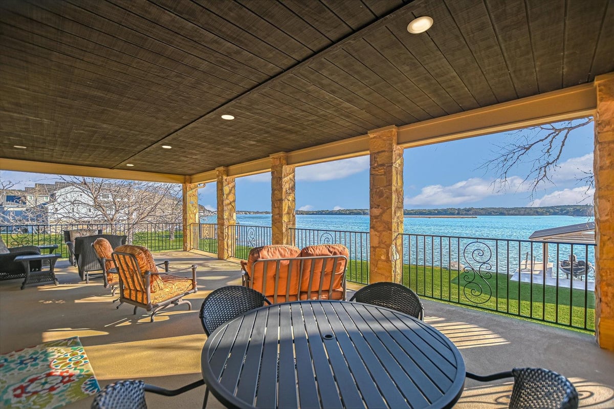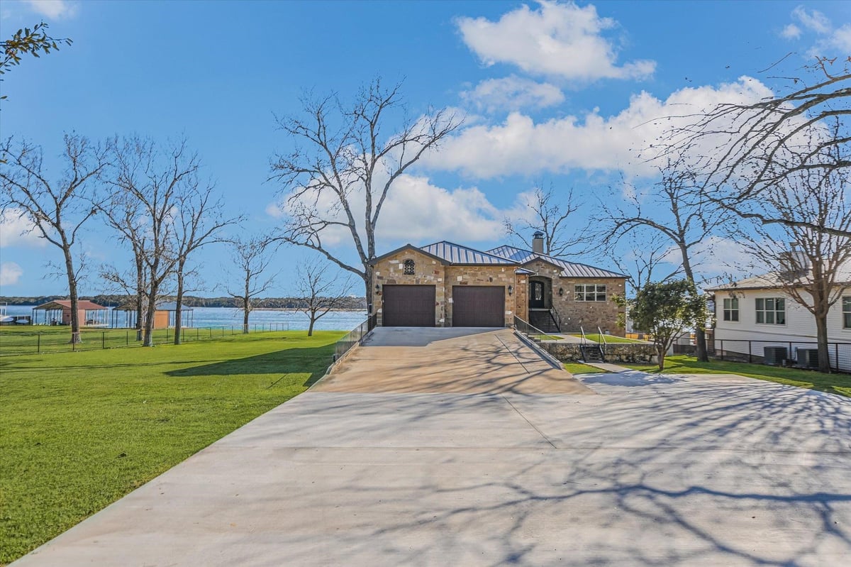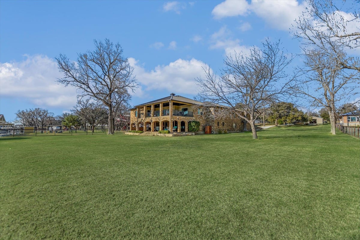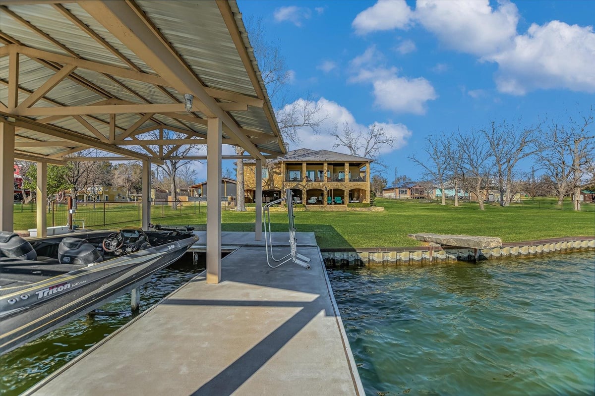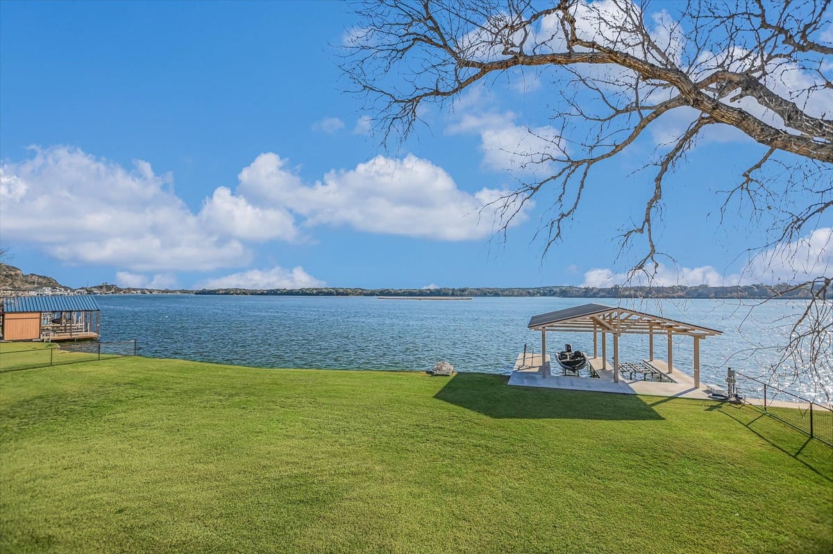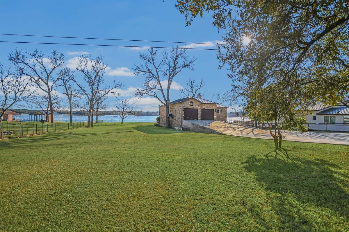 Positioned on two Lake LBJ waterfront lots, 360 Campa Pajama offers 140' of shoreline and sweeping southwest-facing views across the main body of the lake. Built in 2018 with 3-bedrooms, 3.5-baths, plus a dedicated study, the 3,295 sq. ft. home blends comfortable lake living with exceptional indoor & outdoor entertaining spaces. The open-concept living area features soaring ceilings and a wood-burning fireplace, with expansive windows that frame the lake views and fill the space with natural light. The kitchen is anchored by a large center island and offers a convenient butler's pantry for prep and storage space, and a Bosch appliance package including a gas cooktop. Each bedroom features its own ensuite bath, while the study offers a built-in Murphy bed, providing flexible guest accommodations. The spacious primary suite offers a spa-like bath with double vanity, soaking tub, walk-in shower, and generous closet space. The home's appeal extends to its outdoor living areas. A covered patio off the main living area provides front-row seats to Hill Country sunsets, while the lower level offers extensive covered outdoor living and storage space including an outdoor kitchen, wood-burning fireplace, powder bath, outdoor shower, and flex room with mini split. A lush, flat lawn extends from the home to the water's edge, creating an easy connection to the covered two-stall boat dock and a unique diving board. A gated entry and detached storage building provide secure space for boats, lake toys, and equipment.