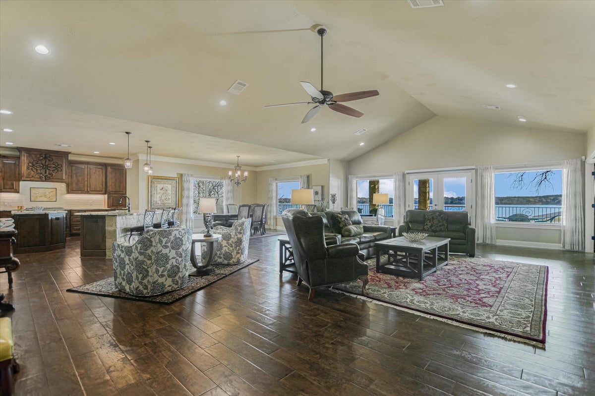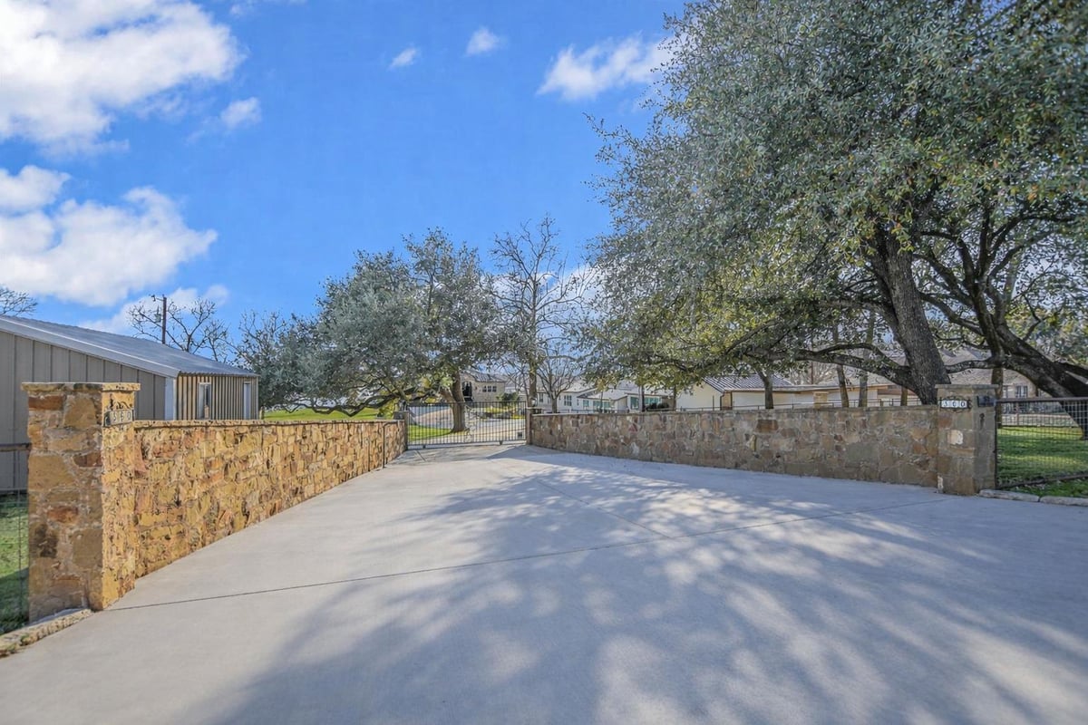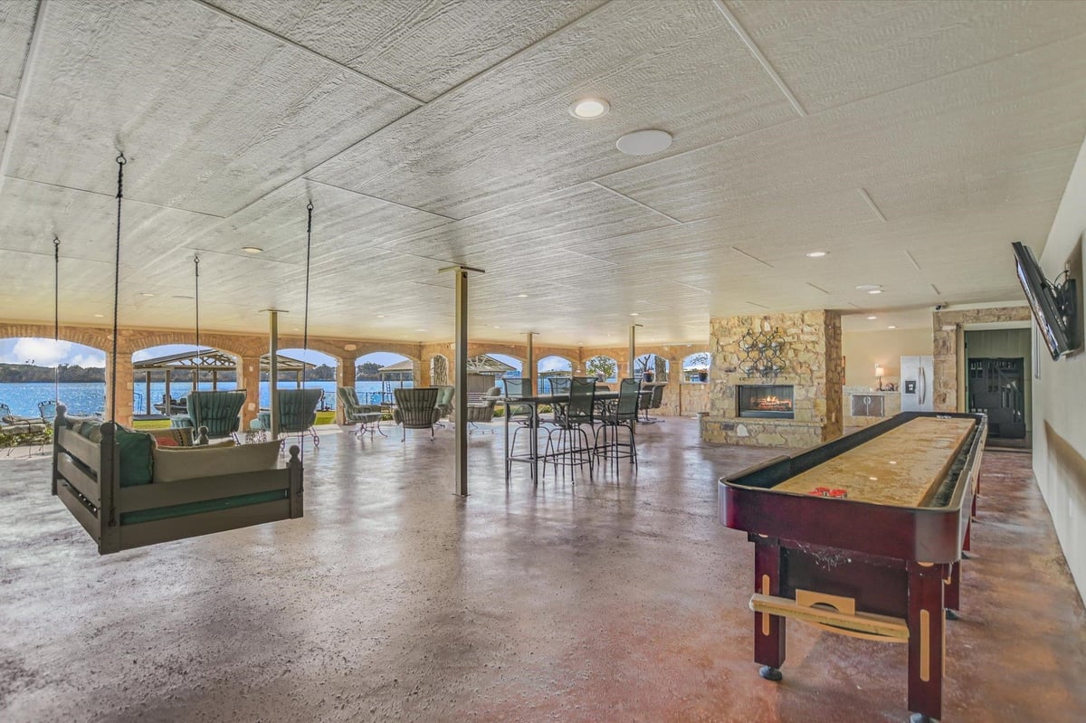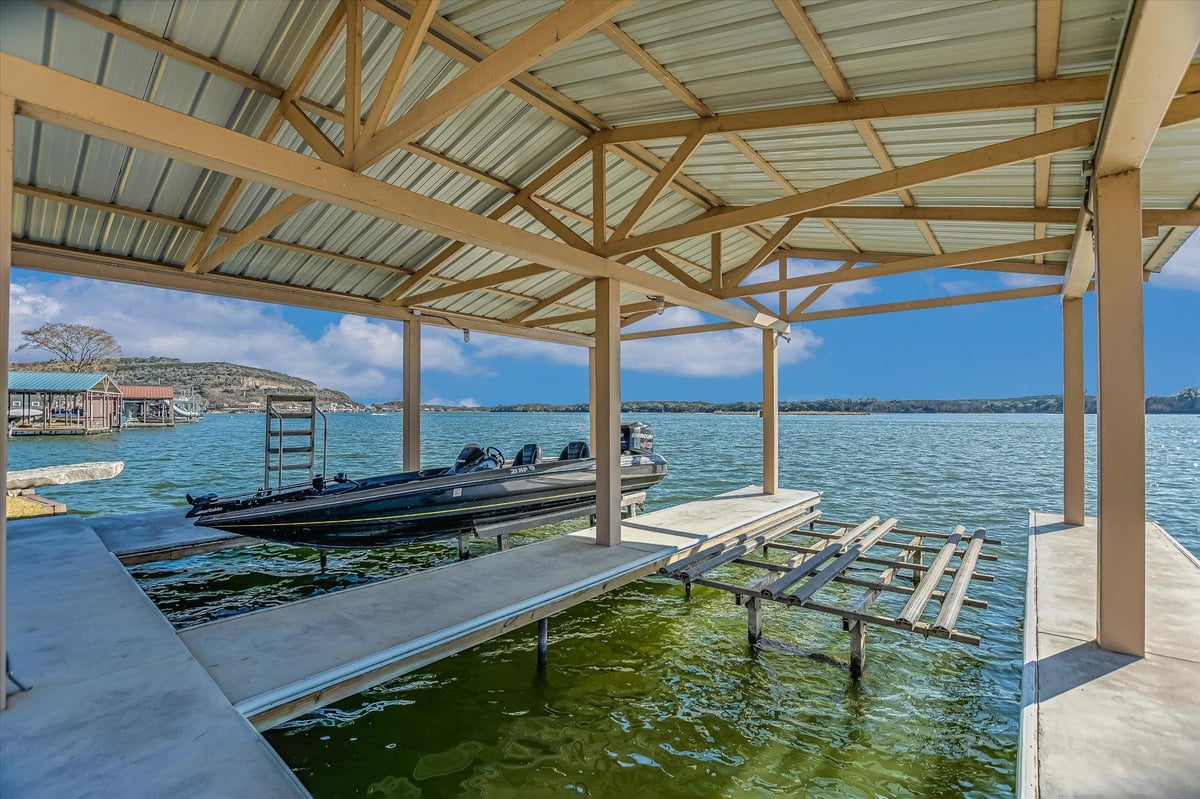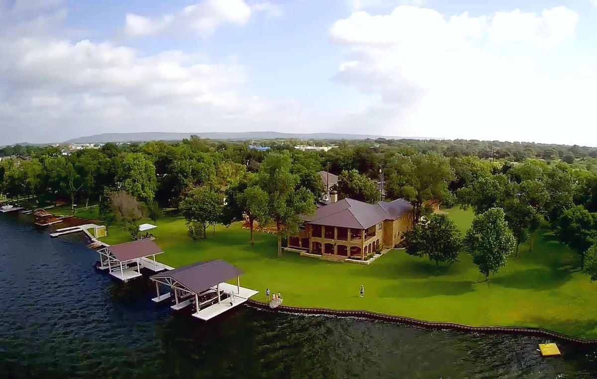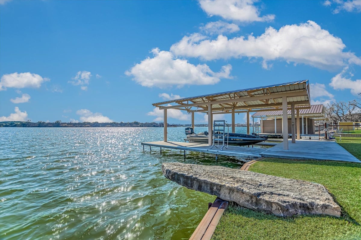 Positioned on two Lake LBJ waterfront lots, 360 Campa Pajama offers 140' of shoreline and sweeping southwest-facing views across the main body of the lake. Built in 2018 with 3-bedrooms, 3.5-baths, plus a dedicated study, the 3,295 sq. ft. home blends comfortable lake living with exceptional indoor & outdoor entertaining spaces. The open-concept living area features soaring ceilings and a wood-burning fireplace, with expansive windows that frame the lake views and fill the space with natural light. The kitchen is anchored by a large center island and offers a convenient butler's pantry for prep and storage space, and a Bosch appliance package including a gas cooktop. Each bedroom features its own ensuite bath, while the study offers a built-in Murphy bed, providing flexible guest accommodations. The spacious primary suite offers a spa-like bath with double vanity, soaking tub, walk-in shower, and generous closet space. The home's appeal extends to its outdoor living areas. A covered patio off the main living area provides front-row seats to Hill Country sunsets, while the lower level offers extensive covered outdoor living and storage space including an outdoor kitchen, wood-burning fireplace, powder bath, outdoor shower, and flex room with mini split. A lush, flat lawn extends from the home to the water's edge, creating an easy connection to the covered two-stall boat dock and a unique diving board. A gated entry and detached storage building provide secure space for boats, lake toys, and equipment.