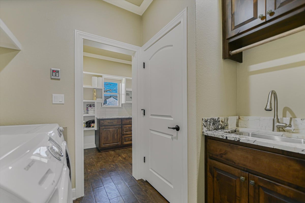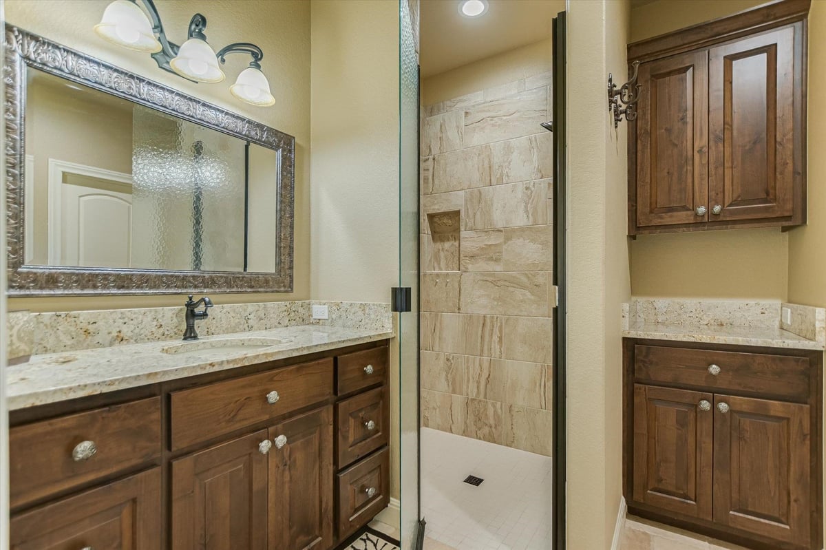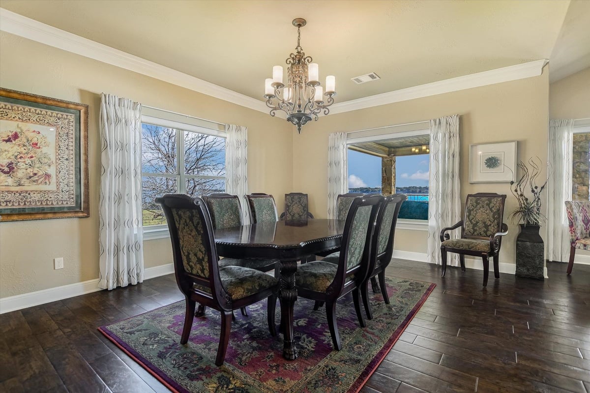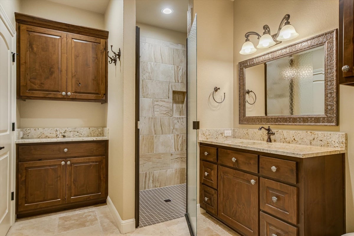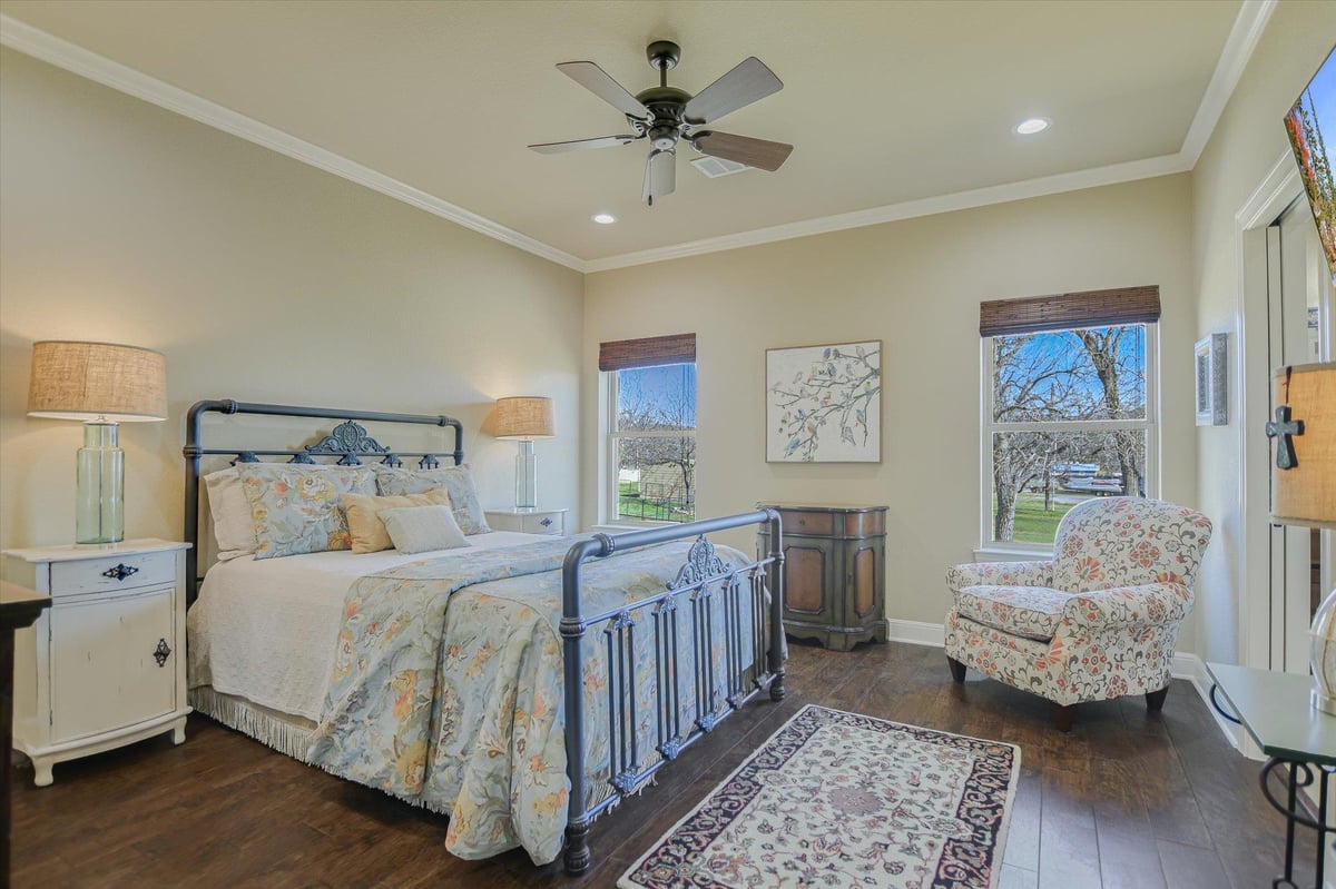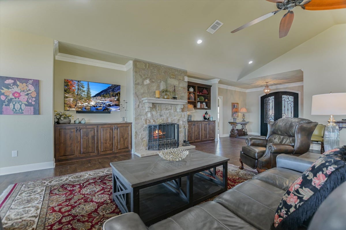 Positioned on two Lake LBJ waterfront lots, 360 Campa Pajama offers 140' of shoreline and sweeping southwest-facing views across the main body of the lake. Built in 2018 with 3-bedrooms, 3.5-baths, plus a dedicated study, the 3,295 sq. ft. home blends comfortable lake living with exceptional indoor & outdoor entertaining spaces. The open-concept living area features soaring ceilings and a wood-burning fireplace, with expansive windows that frame the lake views and fill the space with natural light. The kitchen is anchored by a large center island and offers a convenient butler's pantry for prep and storage space, and a Bosch appliance package including a gas cooktop. Each bedroom features its own ensuite bath, while the study offers a built-in Murphy bed, providing flexible guest accommodations. The spacious primary suite offers a spa-like bath with double vanity, soaking tub, walk-in shower, and generous closet space. The home's appeal extends to its outdoor living areas. A covered patio off the main living area provides front-row seats to Hill Country sunsets, while the lower level offers extensive covered outdoor living and storage space including an outdoor kitchen, wood-burning fireplace, powder bath, outdoor shower, and flex room with mini split. A lush, flat lawn extends from the home to the water's edge, creating an easy connection to the covered two-stall boat dock and a unique diving board. A gated entry and detached storage building provide secure space for boats, lake toys, and equipment.
