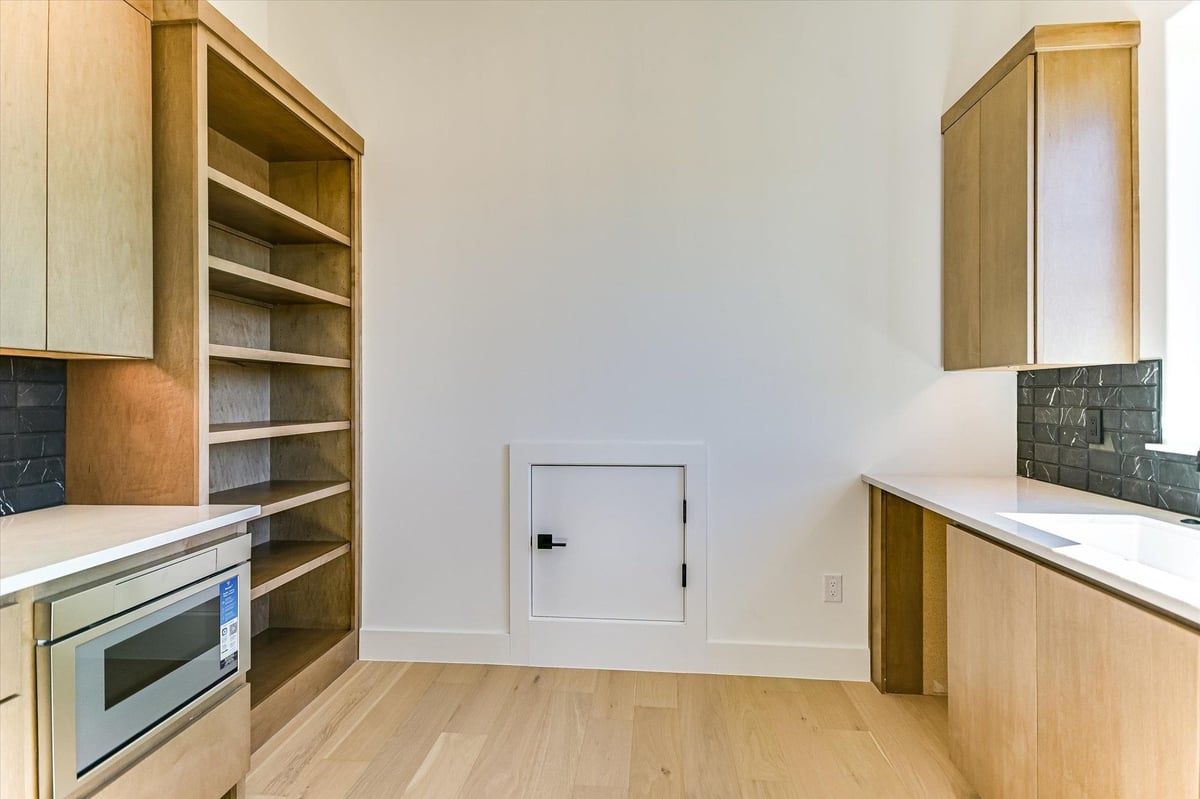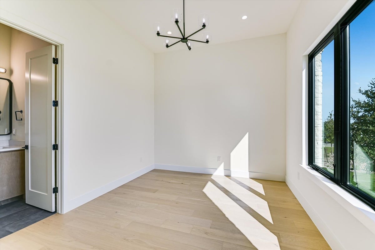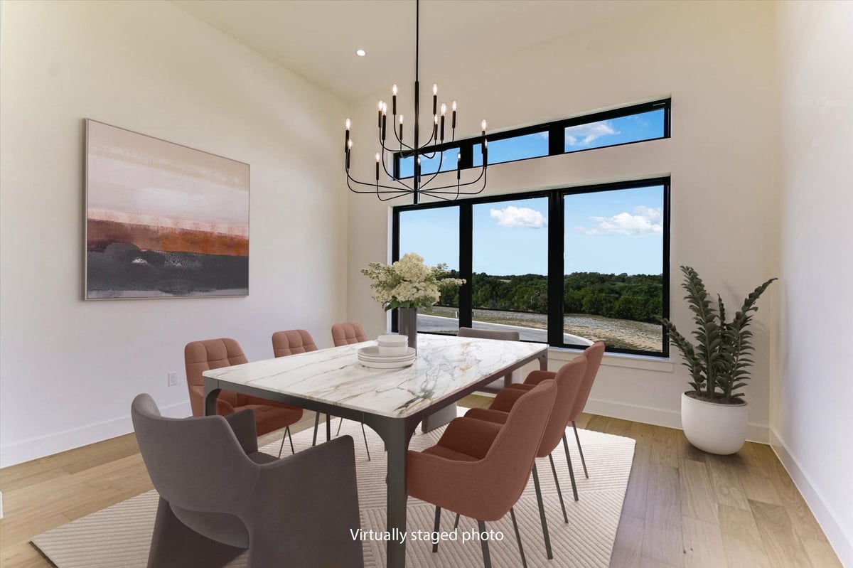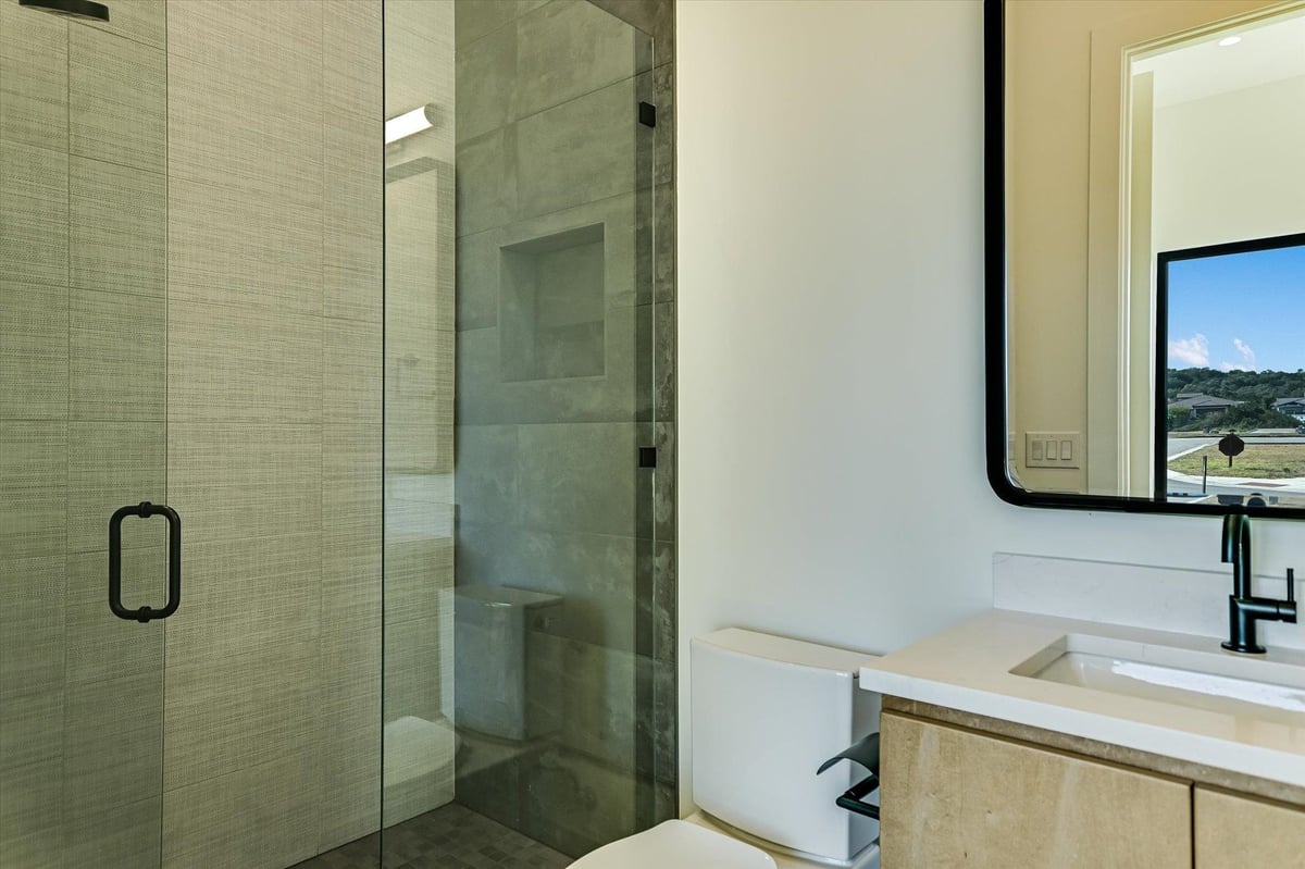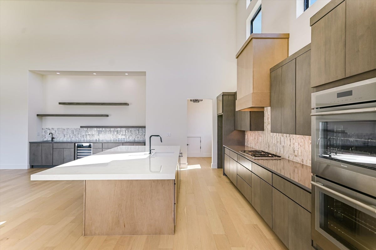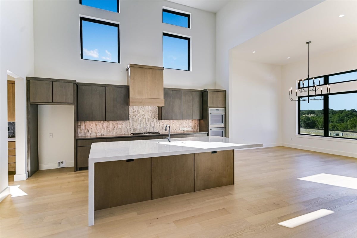 This newly constructed contemporary residence in Tuscan Village offers 2,659 sq. ft. of living space that blends architectural sophistication with low-maintenance luxury. The exterior pairs limestone, smooth stucco, and warm wood accents for a clean, modern presence. Inside, soaring ceilings and expansive windows flood the interiors with natural light, while curated finishes and meticulous craftsmanship define every space. The open-concept living area, anchored by a dramatic floor-to-ceiling fireplace, flows seamlessly to the covered patio through oversized sliding glass doors--creating an ideal setting for relaxed entertaining or quiet evenings at home. An outdoor kitchen with built-in grill extends the living space and captures Hill Country sunsets. The kitchen is designed to perform and impress, featuring quartz countertops, a Thermador gas cooktop, and generous island. The prep kitchen adds storage, workspace, and a convenient grocery pass-through from the garage. The primary suite boasts private patio access, an oversized walk-in closet, and a spacious bath with dual vanities, backlit mirrors, and a walk-in shower with dual showerheads. Two additional guest suites offer en-suite baths, ensuring comfort and privacy. Designed for a true lock-and-leave lifestyle, the home includes a two-car garage with golf cart storage and complimentary landscape maintenance, allowing owners to come and go with ease. Tuscan Village amenities include a clubhouse, pool, fitness center, pickleball and bocce ball courts.